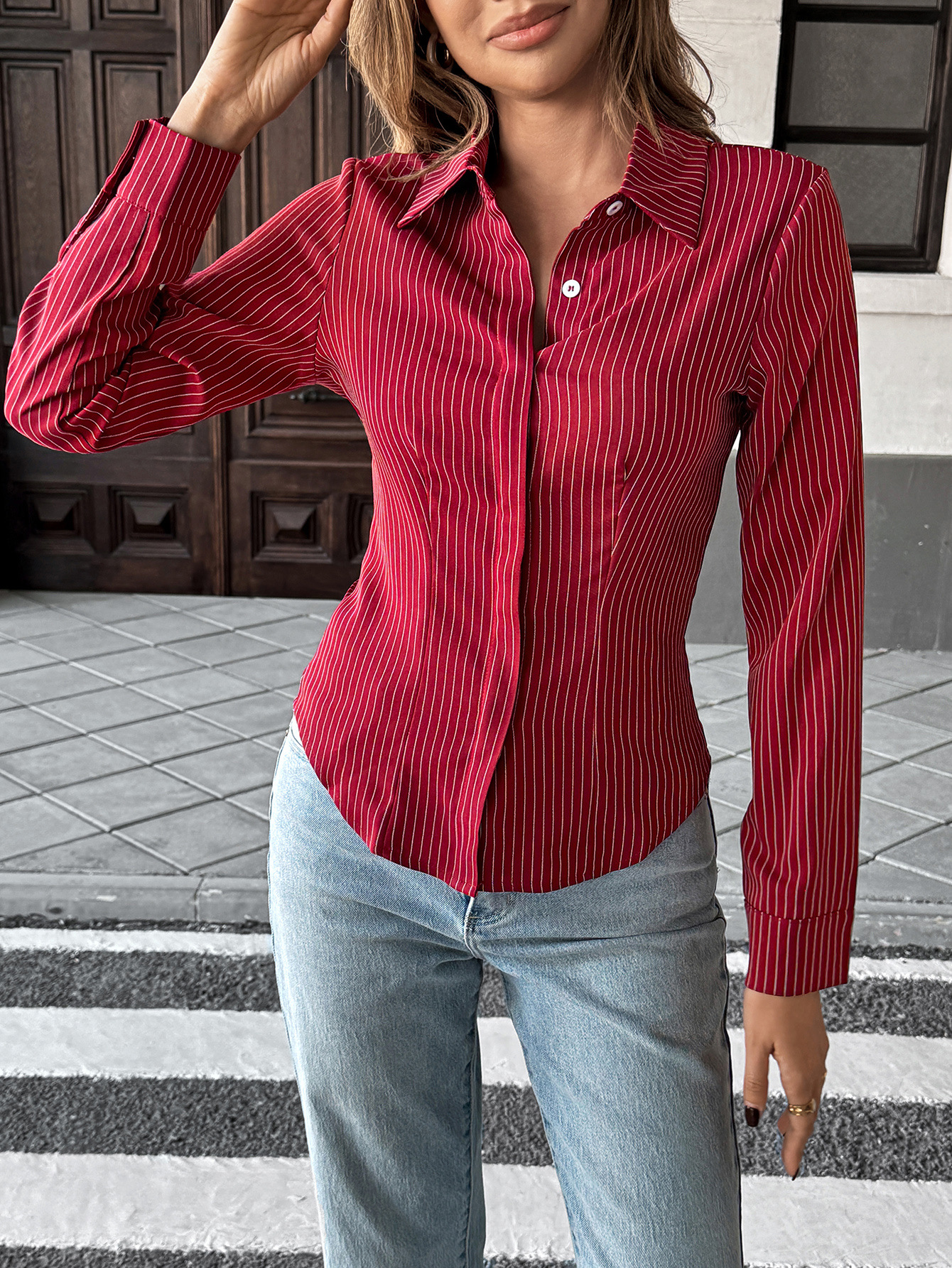 Casual Polo Collar Striped Blouse