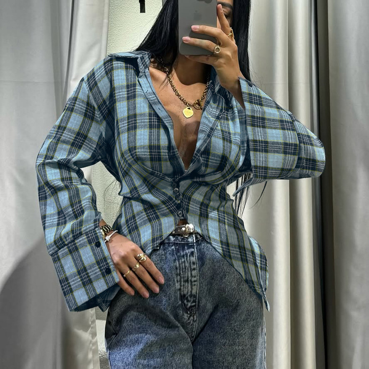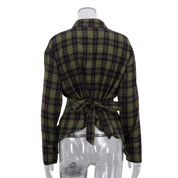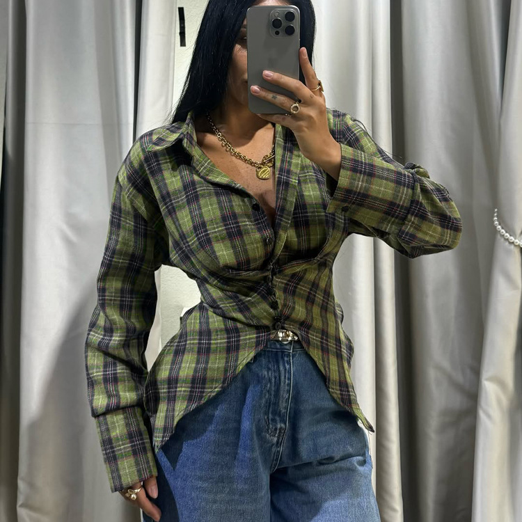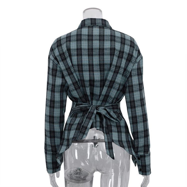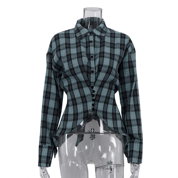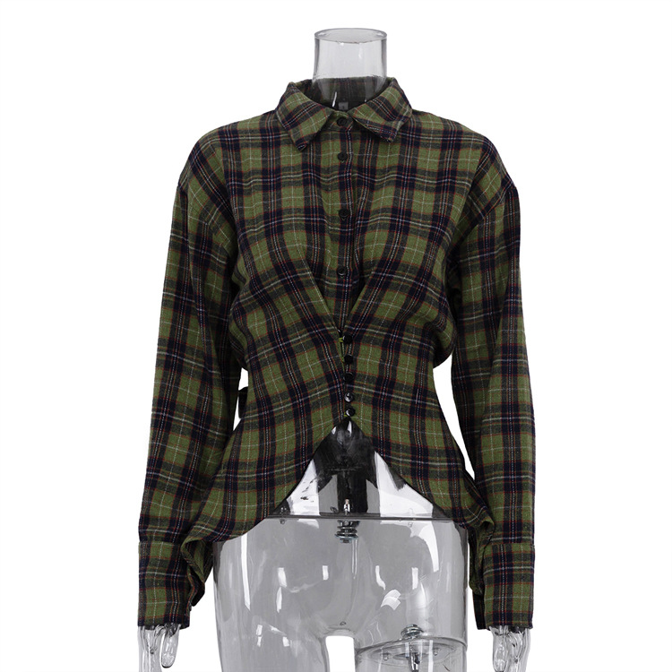 Retro Plaid Collared Long Sleeve Irregular Asymmetric Hem Cinched Blouse